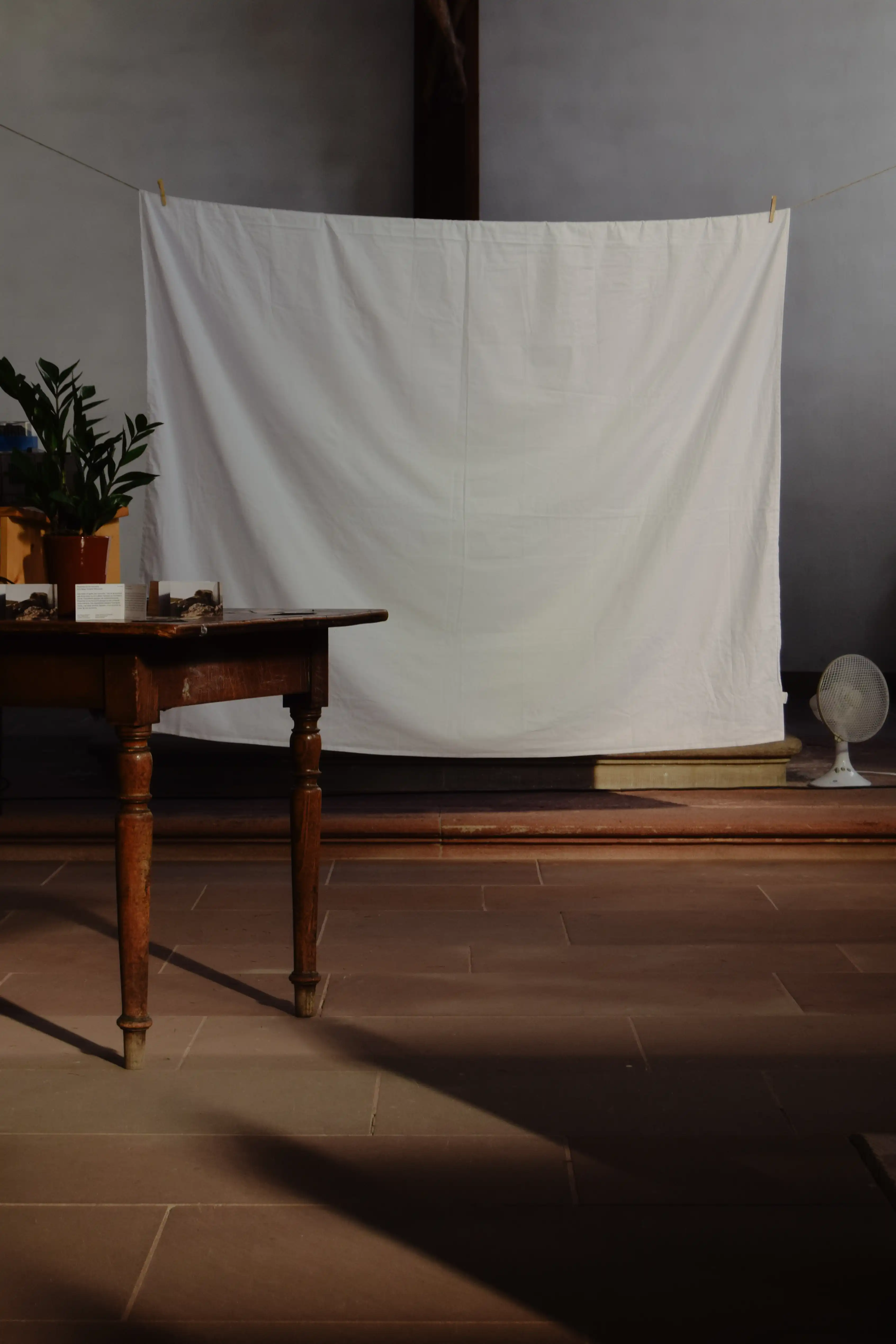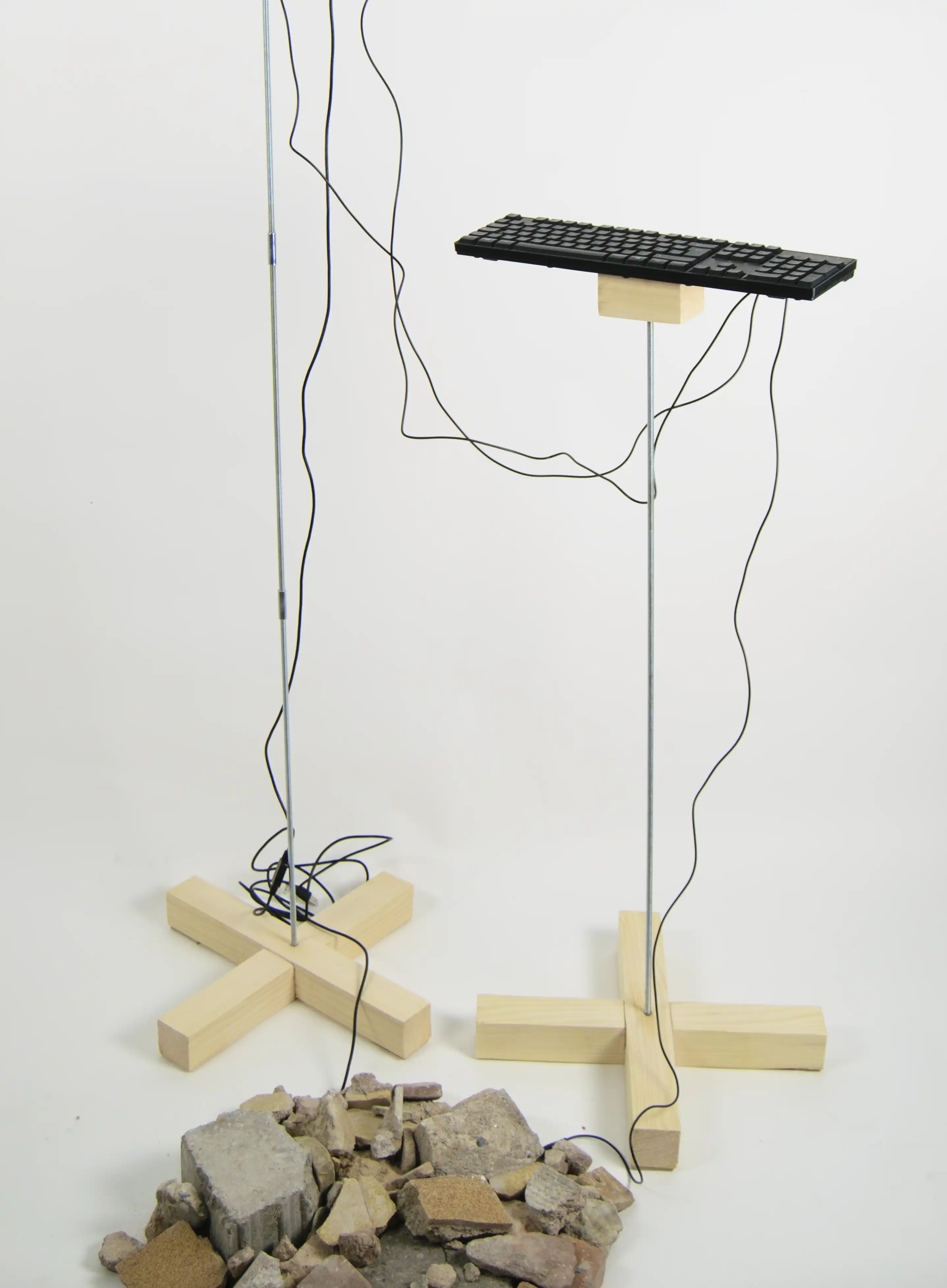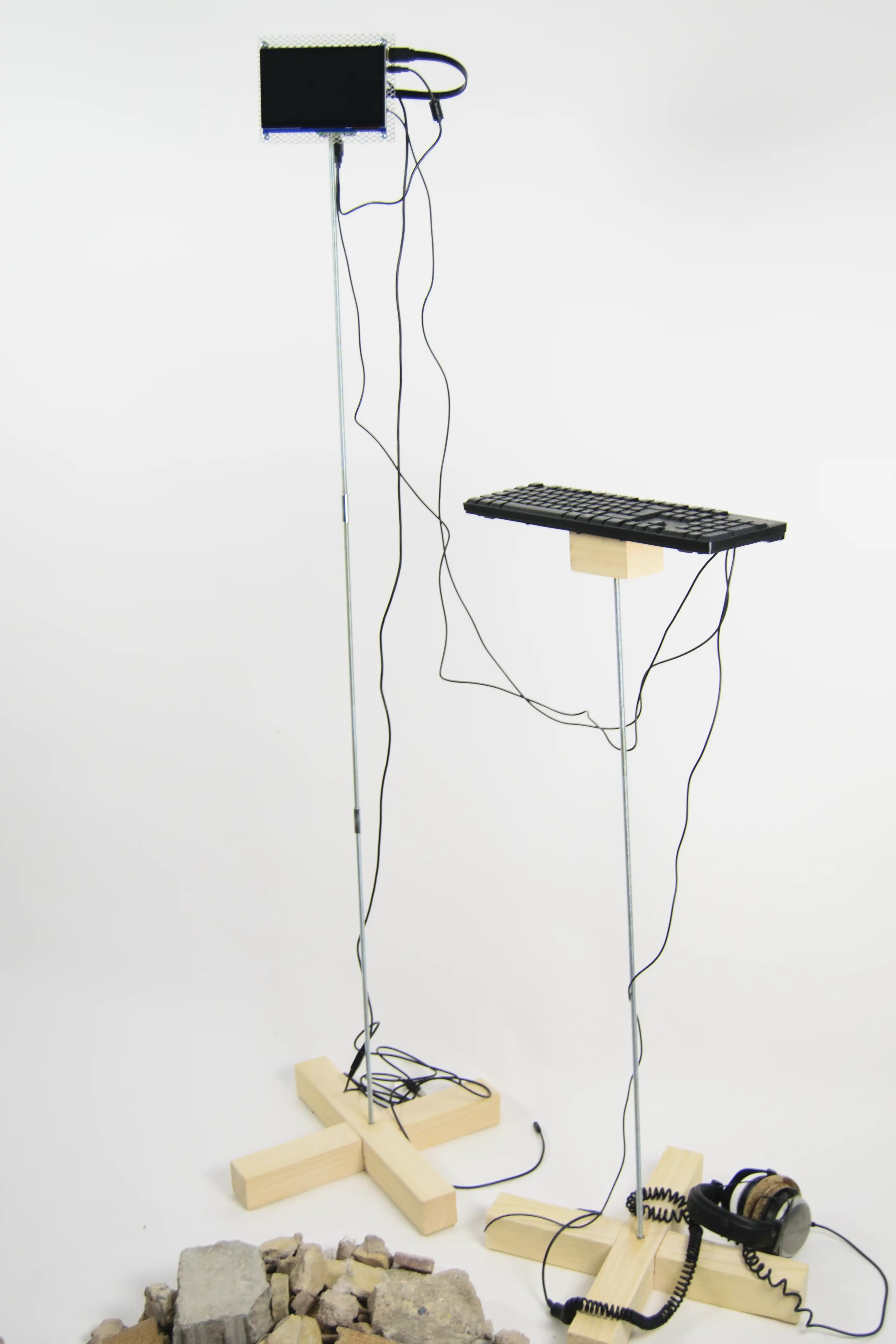 Simone Weil définissait le malheur comme « la vérité de notre condition ». Cette dernière est une combinaison de trois éléments : la douleur, la détresse et la dégradation sociale. En lien avec les archives de l’INA, cette installation propose de questionner la place de cette émotion dans notre condition humaine, mais aussi d’interroger l’importance du numérique dans la conservation de cette détresse. Déséquilibré, debout sur les débris, face à une dure réalité, l’installation rend tangible notre condition par l’expérimentation de la détresse. Un contraste s’opère entre les fondations du propos et la fragilité de l’installation qui oscille au grès du vent. Cette instabilité entre en résonance avec la notion d’un monde constamment en mouvement. L’ensemble est visible sur un écran dont les dimensions sont proches de celles d’un téléphone portable, outil avec lequel nous fabriquons, échangeons et enregistrons nos données numériques. L’interface avec laquelle nous interagissons est codée en *Bash (code primaire) et rappelle les notions de fondation. Cette dernière nous interroge sur le consentement d’observer cette détresse. Nous sommes alors responsable de ce que nous observons ce qui nous place dans une possible volonté de réagir.