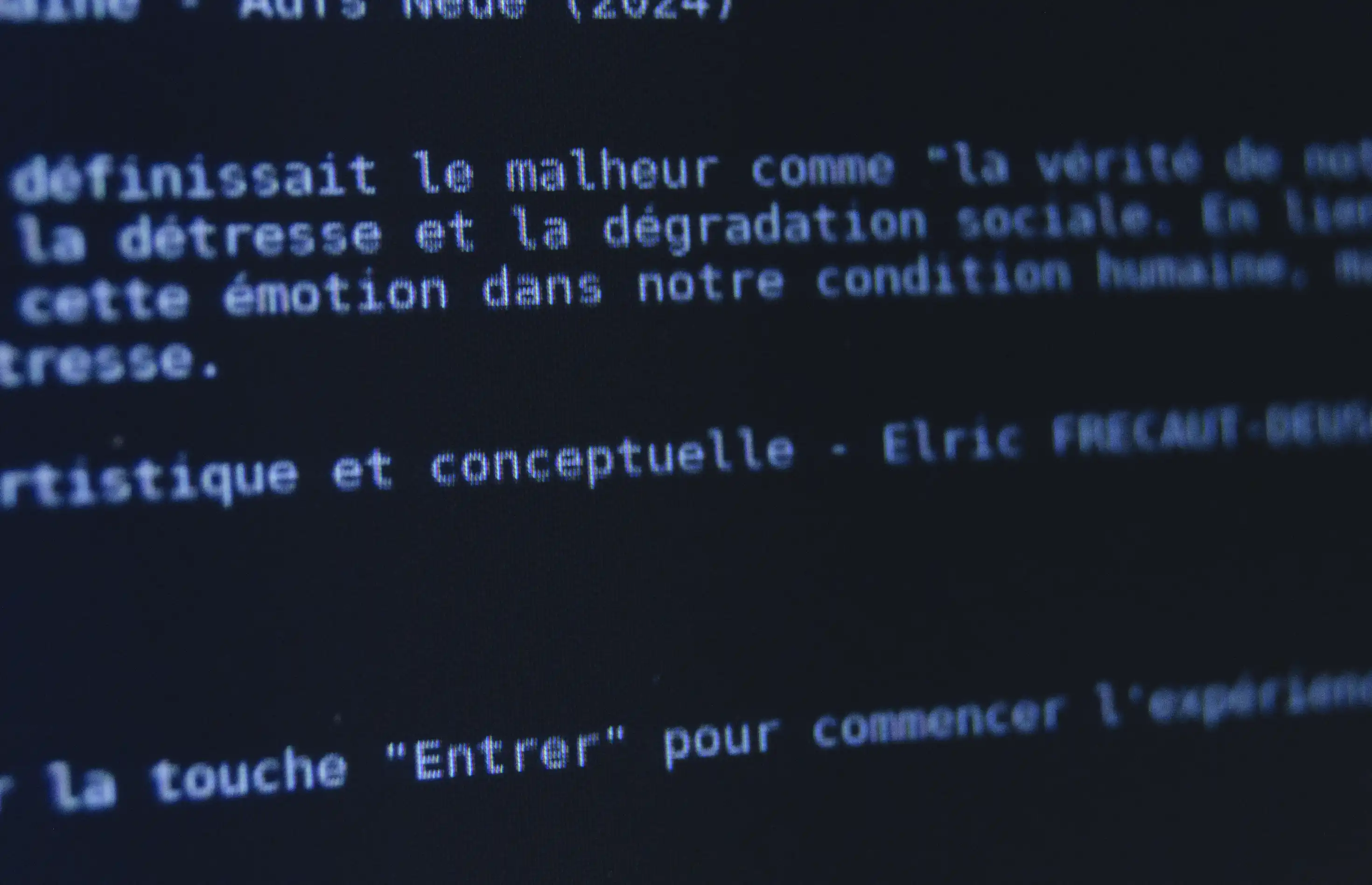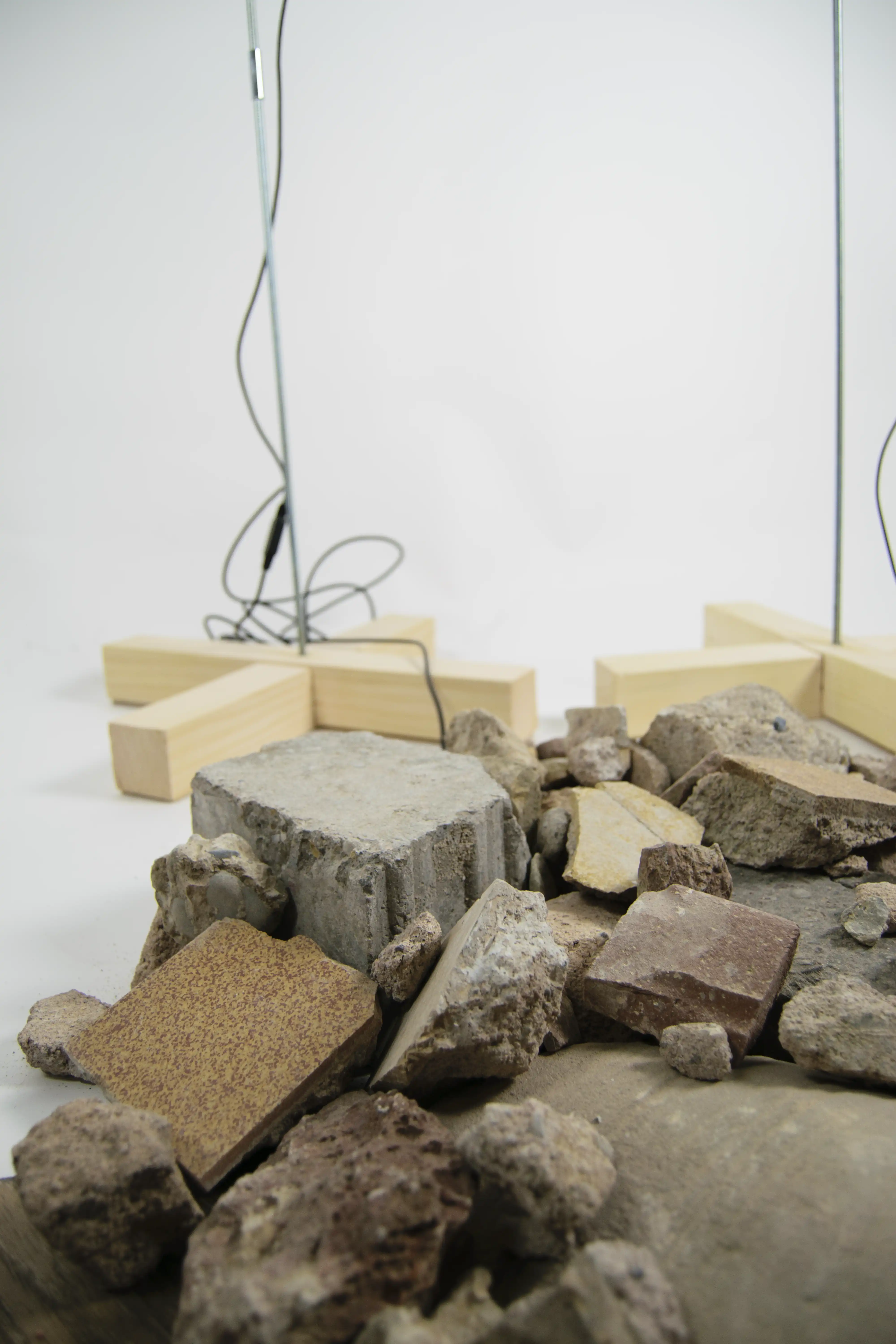 Simone Weil définissait le malheur comme « la vérité de notre condition ». Cette dernière est une combinaison de trois éléments : la douleur, la détresse et la dégradation sociale. En lien avec les archives de l’INA, cette installation propose de questionner la place de cette émotion dans notre condition humaine, mais aussi d’interroger l’importance du numérique dans la conservation de cette détresse. Déséquilibré, debout sur les débris, face à une dure réalité, l’installation rend tangible notre condition par l’expérimentation de la détresse. Un contraste s’opère entre les fondations du propos et la fragilité de l’installation qui oscille au grès du vent. Cette instabilité entre en résonance avec la notion d’un monde constamment en mouvement. L’ensemble est visible sur un écran dont les dimensions sont proches de celles d’un téléphone portable, outil avec lequel nous fabriquons, échangeons et enregistrons nos données numériques. L’interface avec laquelle nous interagissons est codée en *Bash (code primaire) et rappelle les notions de fondation. Cette dernière nous interroge sur le consentement d’observer cette détresse. Nous sommes alors responsable de ce que nous observons ce qui nous place dans une possible volonté de réagir.